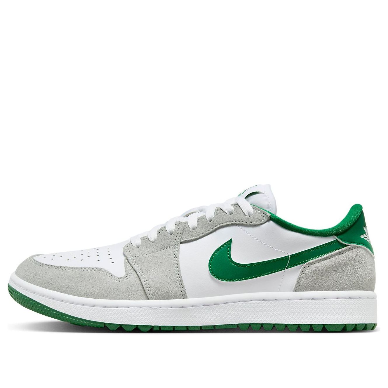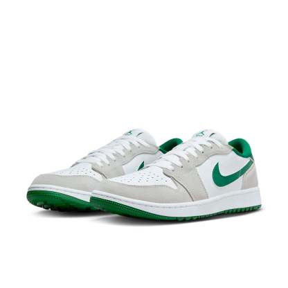 The Air Jordan 1 Low Golf 'Pine Green' tees off with a refreshing blend of White, Pine Green, and Light Smoke Grey. Designed for the golf course, this sneaker boasts a full leather build with mesh tongues and lining. The base, in pristine white, provides the perfect canvas for the contrasting hits: “Pine Green” leather Swooshes, liner, and outsole, along with “Light Smoke Grey” suede overlays. The tongue branding, insoles, and heels also sport the titular green hue.