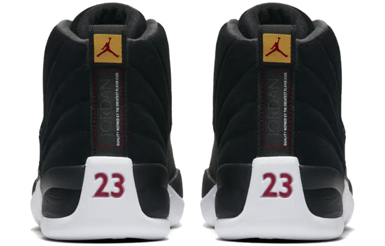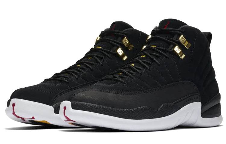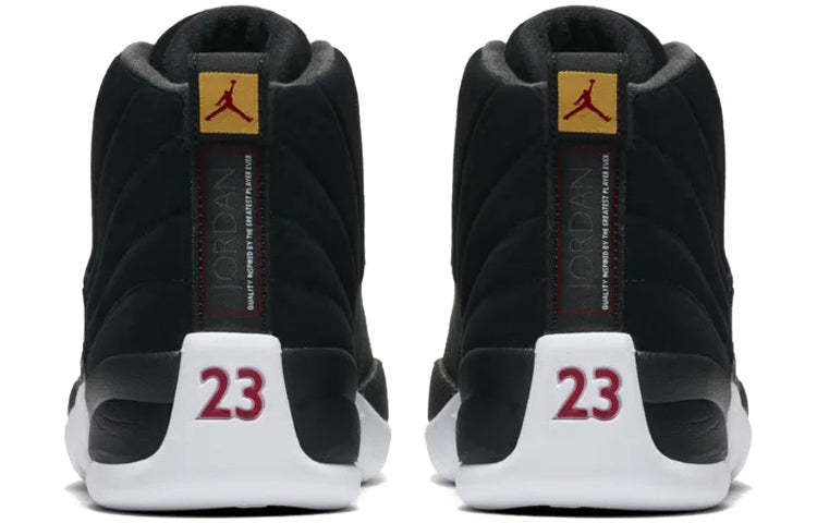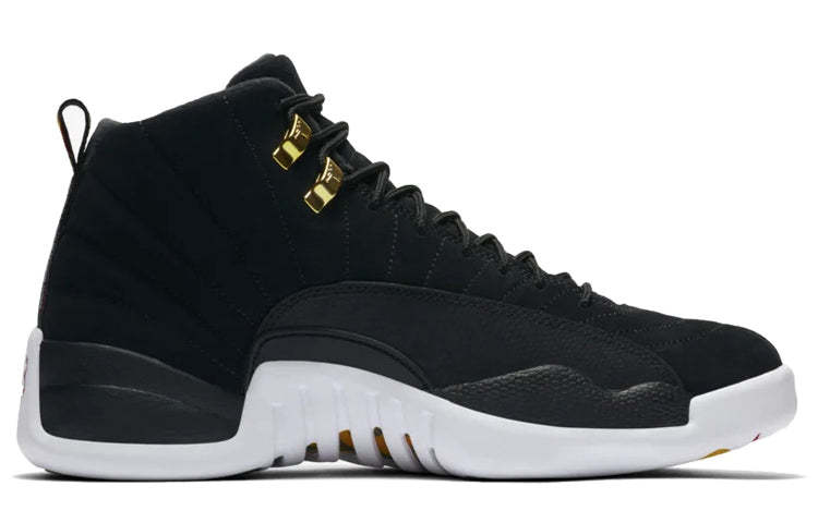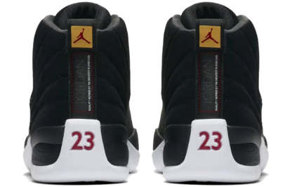 As part of Jordan Brand's Holiday 2019 lineup, the Air Jordan 12 Retro "Reverse Taxi" flips the signature color scheme around to give us a vision in black. The black nubuck upper is accented by reptilian mudguard and metallic gold eyelets. The iconic "23" lettering and sole design complete the aesthetic.