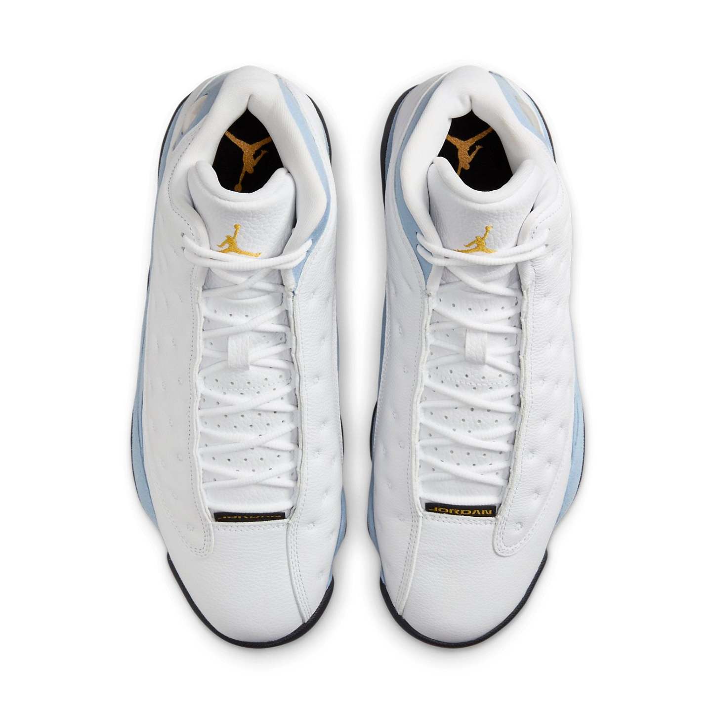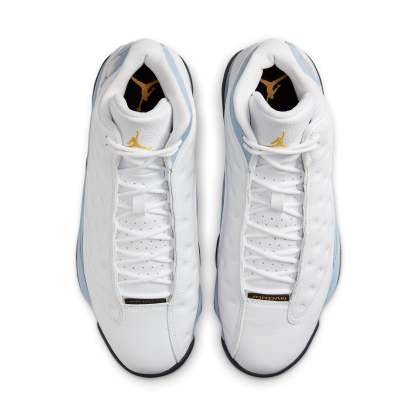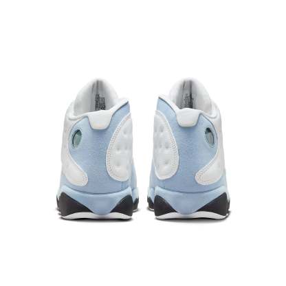 The Jordan 13 Retro Blue Gray features a crisp white leather upper with blue/gray suede accents, creating a striking contrast. The quilted design and panther paw outsole provide both style and grip, while Zoom Air cushioning ensures comfort. This iconic sneaker, released in February 2024, is a must-have for any Jordan fan.