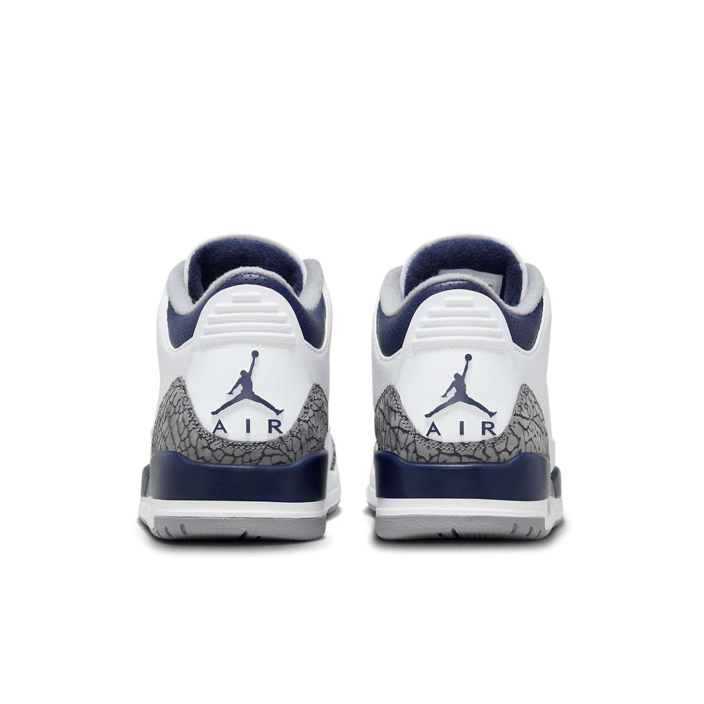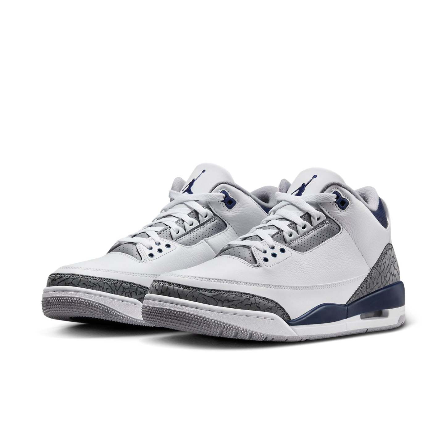 The Jordan 3 Retro Midnight Navy pays homage to the iconic 'White Cement' colorway with a classic color arrangement. Featuring a white leather upper, Cement Gray elephant print detailing, and Midnight Navy accents, this shoe offers a captivating visual contrast. The Air-assisted polyurethane midsole provides comfort, while the Jumpman branding adds a contemporary touch.