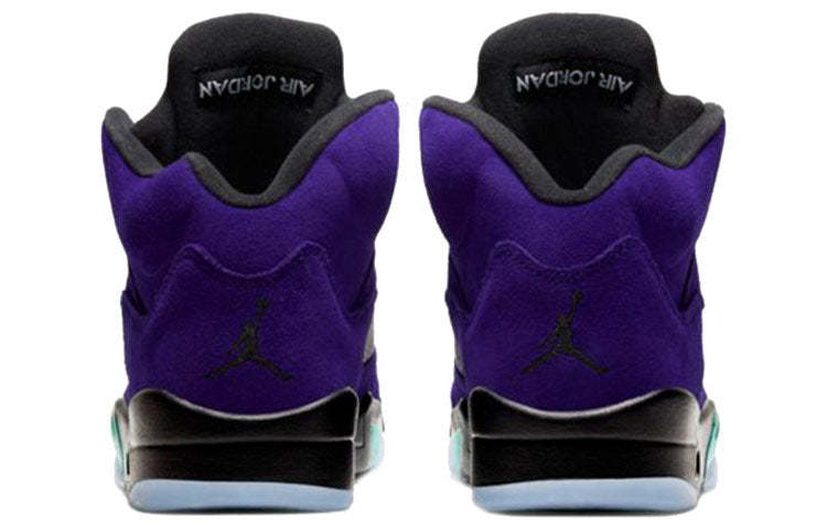 Primarily dressed in purple suede, the Nike Air Jordan 5 Retro "Alternate Grape" features an exciting mix of colors and materials. Against the dark main color scheme, you find the Jumpman logo and midsole detailing in the vibrant "New Emerald".