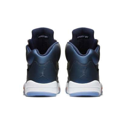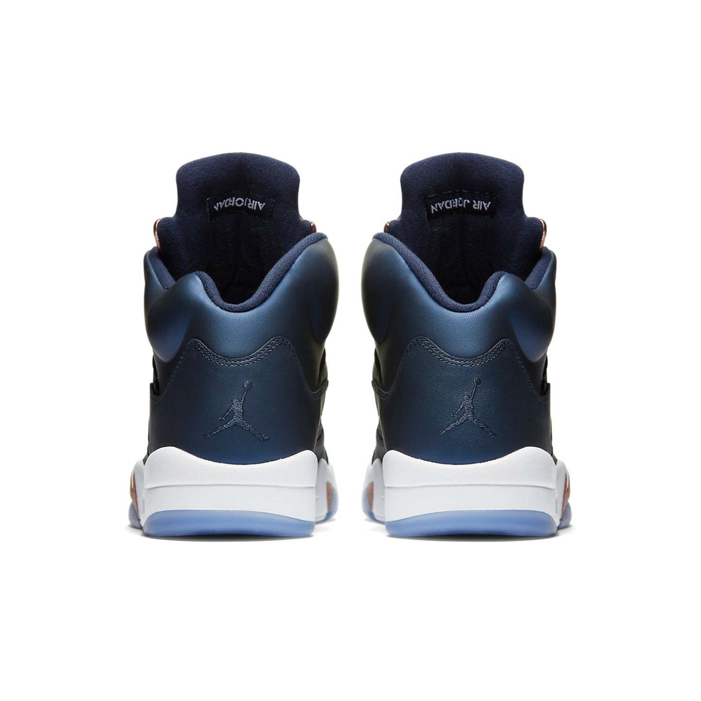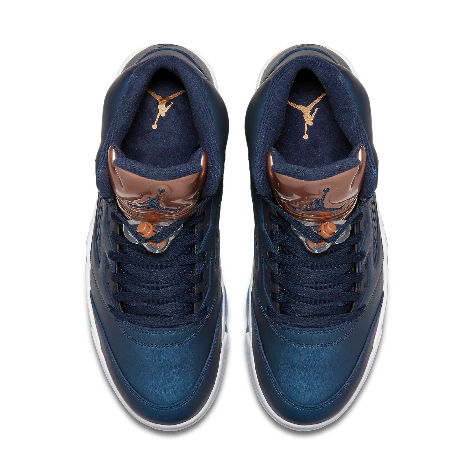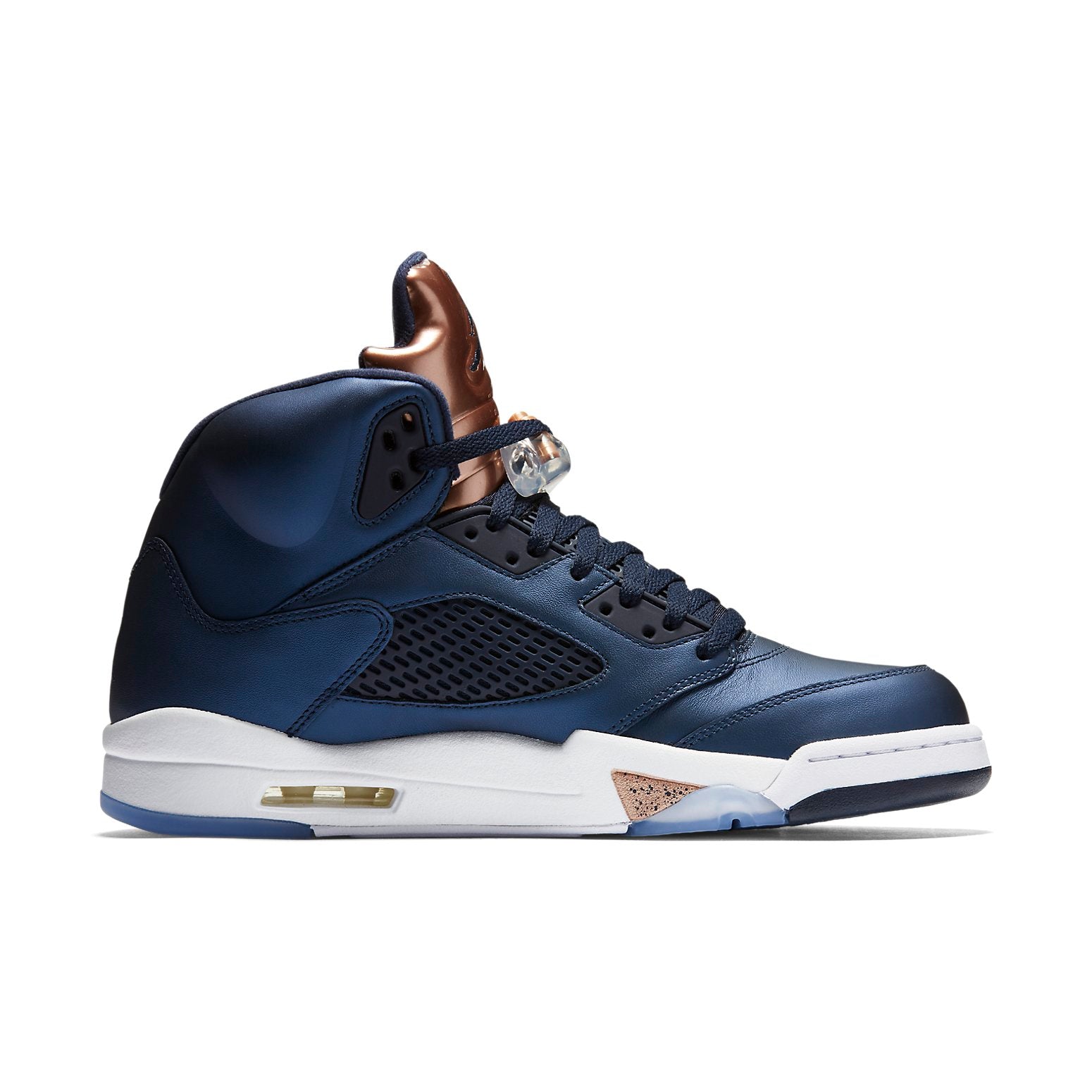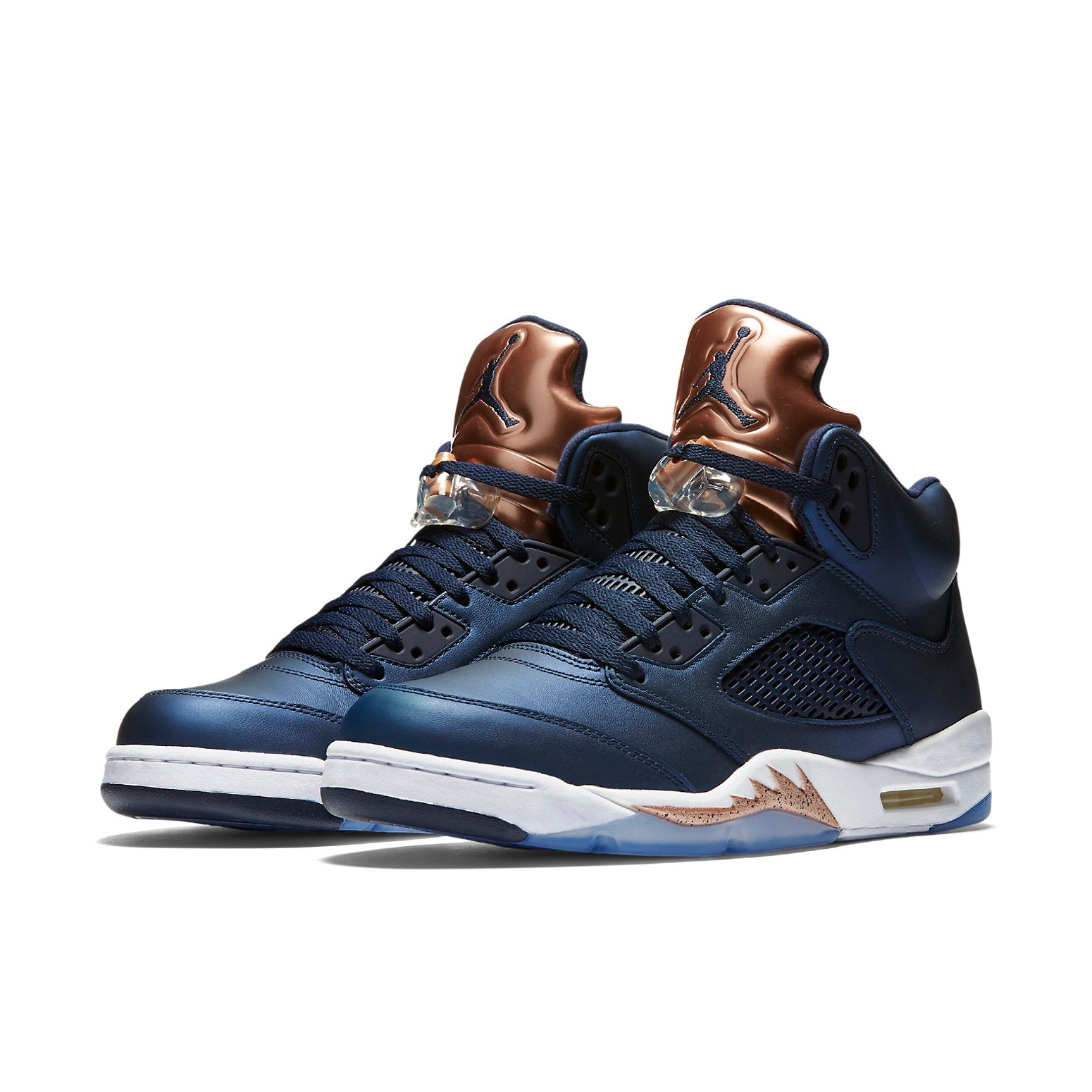 This Nike Air Jordan 5 Retro 'Bronze' features an Obsidian, White, Metallic Red Bronze, and Bright Grape color palette. Also, it comes with a Metallic Red Bronze tongue inspired by the medals handed out for third place. SKU: 136027-416 Release Date: 24 Sep,2016 Color: Obsidian/White-Metallic Red Bronze-Bright Grape