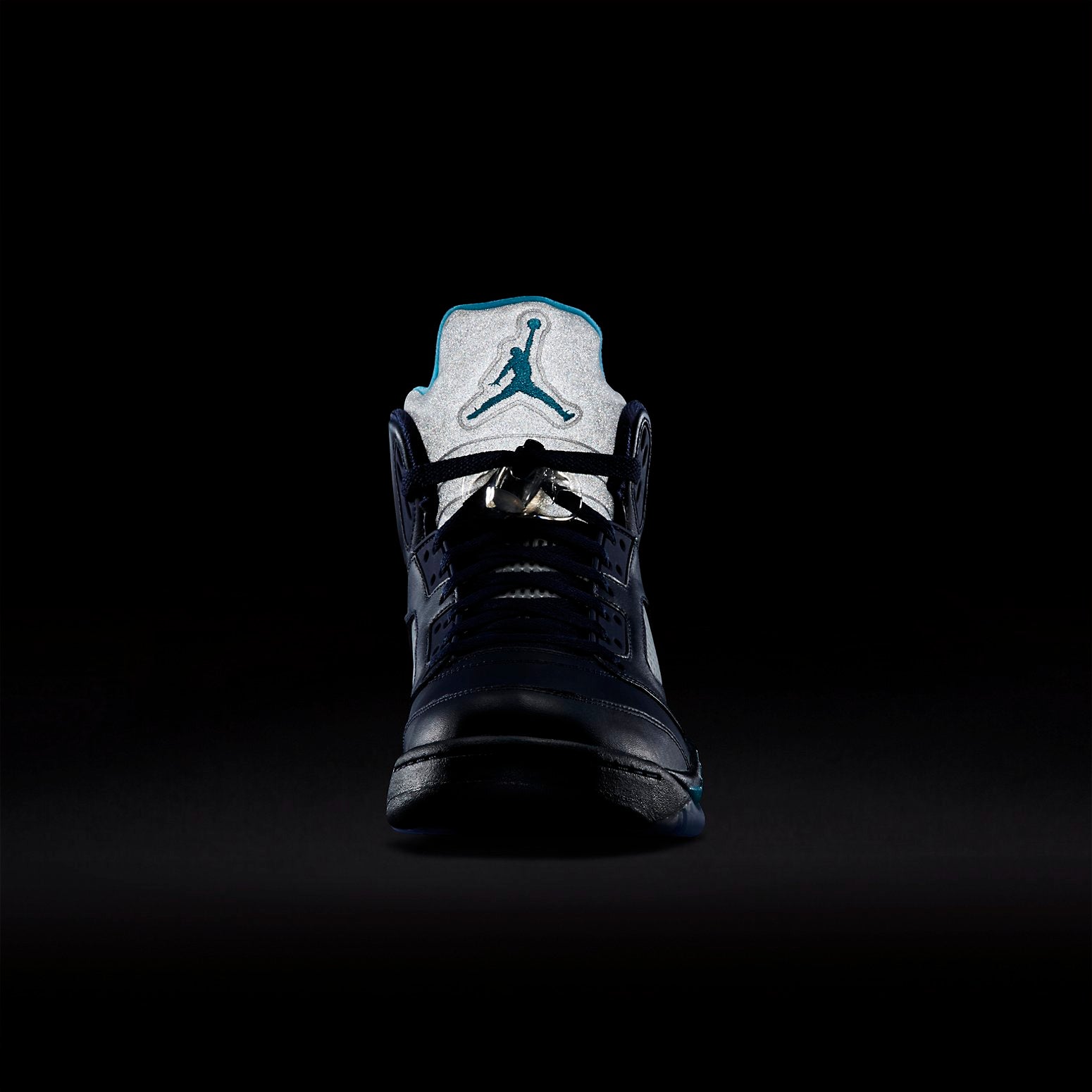Introducing the Nike Air Jordan 5 'Pre-Grape'! This special sneaker is inspired by a 1990 Tinker Hatfield sample that was intended to be released instead of the iconic 'Grape' colorway. The sneaker features a Midnight Navy leather upper, grey and turquoise accents, and a 3M reflective tongue. Released in May 2015, the design also includes turquoise shark teeth and an icy blue translucent outsole. Whether you're a casual sneakerhead or a hardcore collector, this shoe is a must-have for your collection!