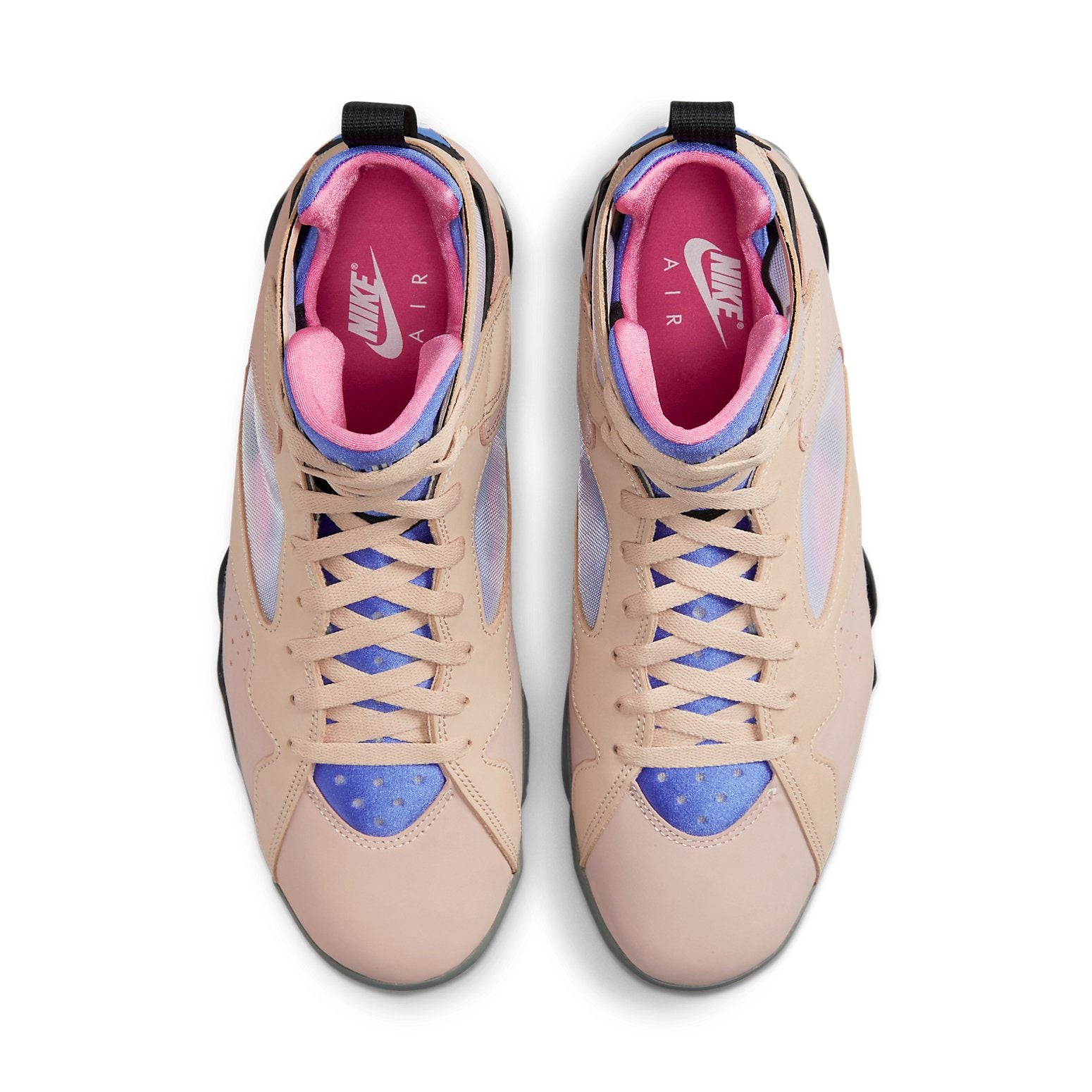 In celebration of the 30th anniversary of the Air Jordan 7, Jordan Brand is releasing a special edition ‘Sapphire’ colorway. This retro silhouette has been updated with fresh colors and a new construction, making it a must-have for any Air Jordan fan. The upper is crafted from layered nubuck in a muted pink hue, with semi-translucent mesh on the quarter panel and collar for breathability. A neoprene inner sleeve in sapphire and pink provides a snug, comfortable fit, while a webbing pull tab at the heel makes it easy to slip on and off. The mid-top is mounted on a speckled grey foam midsole with encapsulated Air-sole cushion