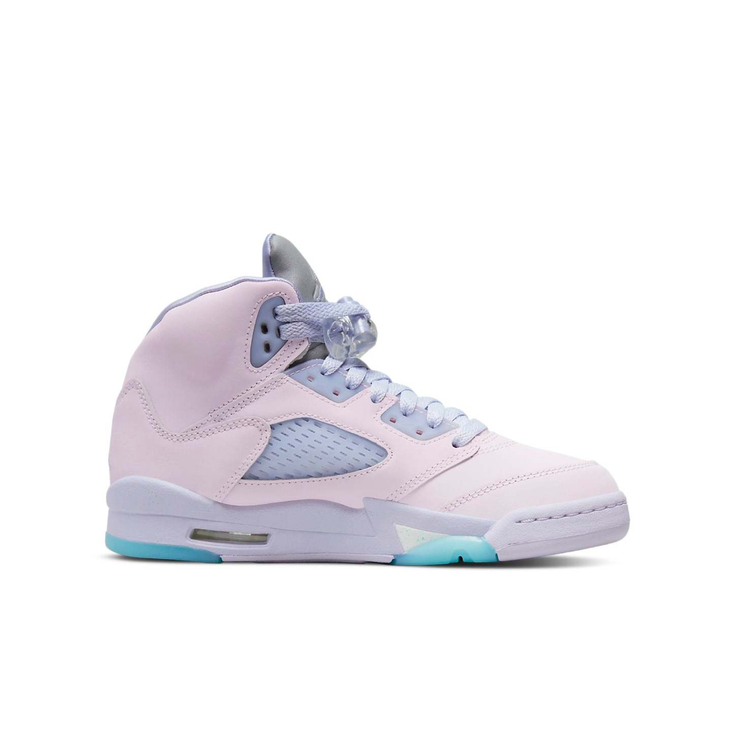 The Air Jordan 5 Retro SE GS 'Easter' is the perfect shoe for grade schoolers, packed with support and structure. A light pink leather base with blue mesh side panels and a metallic tongue featuring the iconic Air Jordan logo give these shoes a unique Easter-inspired design. The white midsole and blue outsole provide extra stability and make this model suitable for both casual wear and basketball. Don't miss out on this stylish sneaker!