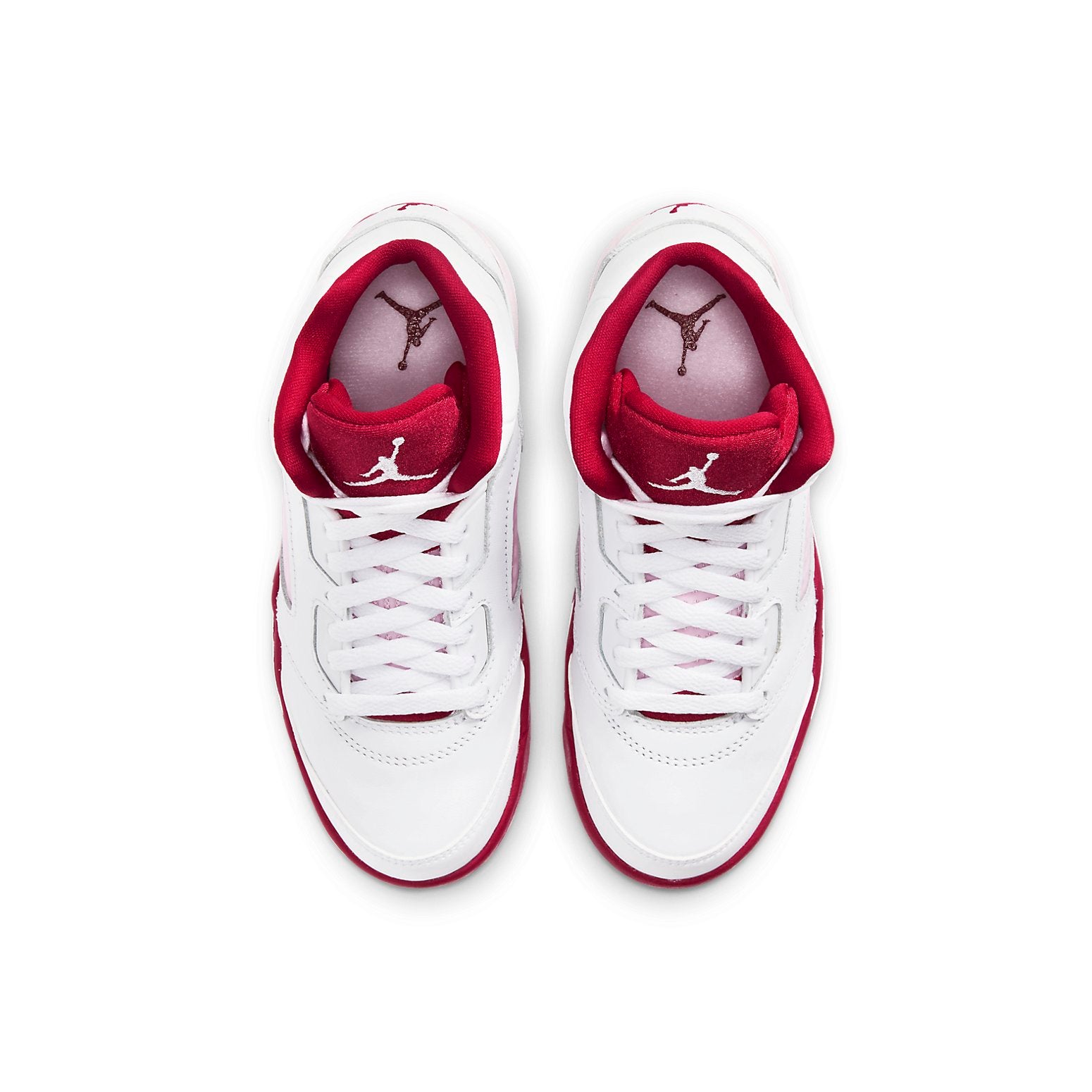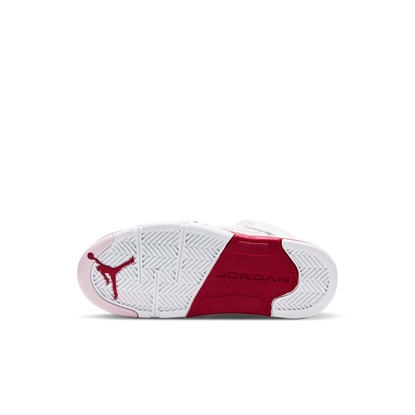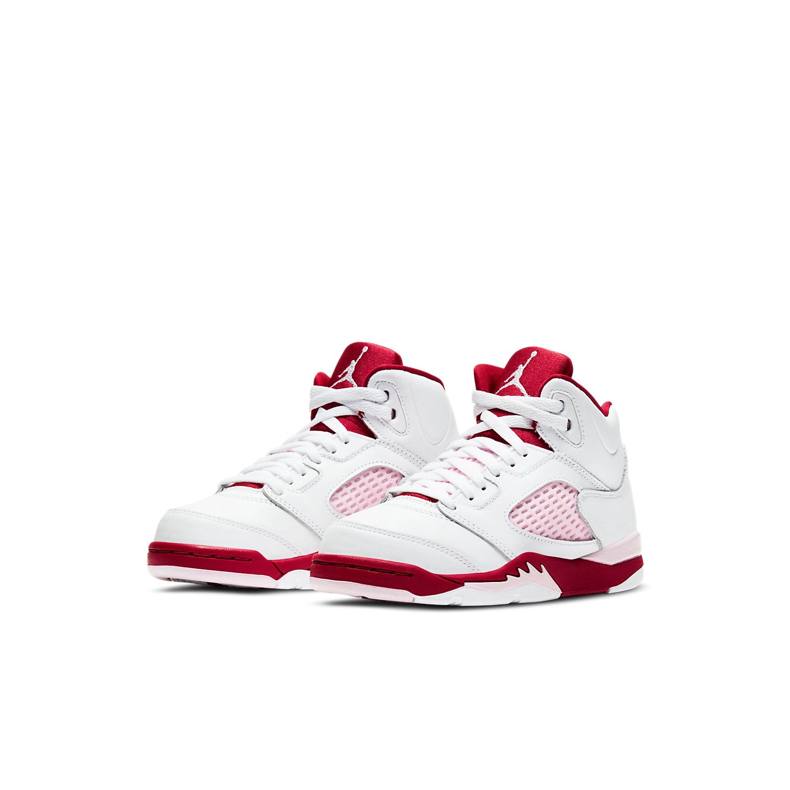 Introducing the Air Jordan 5 Retro PS 'Pink Foam' – a sneaker made for little feet that delivers a rosy colorway of the classic Air Jordan 5 silhouette. The mid-top sneaker features a white leather upper with pink netting on the quarter panel and Gym Red accents on the tongue, collar lining and Jumpman heel logo. The foam midsole is accented with signature shark tooth detailing and Nike Air cushioning for a comfortable ride. If you're looking for a sneaker that bridges the gap between classic style and modern comfort, the Air Jordan 5 Retro PS 'Pink Foam' is the perfect choice.